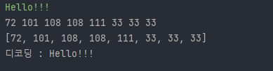 "Hello!!!" 를 입력하면 default charset으로 인코딩된 byte 배열이 만들어져서 출력된다.