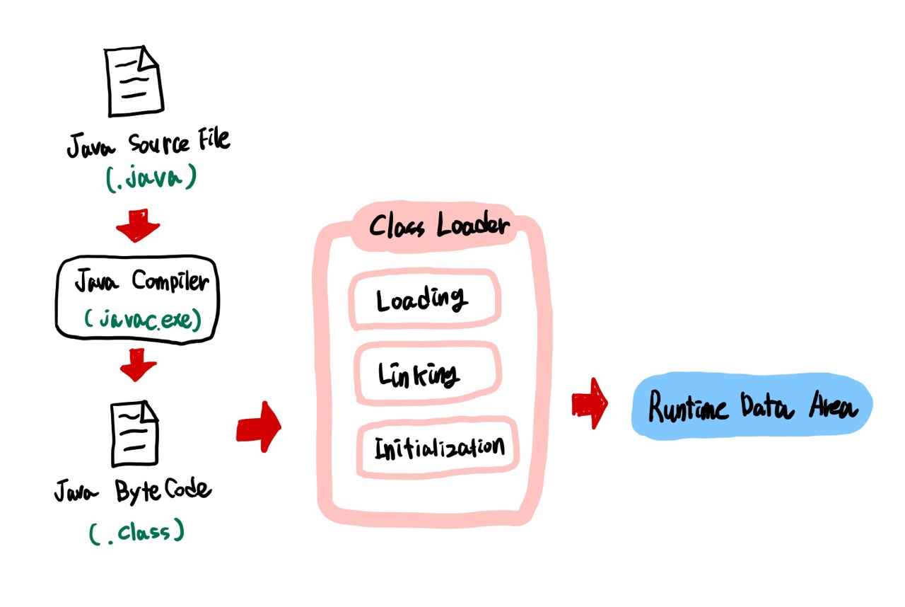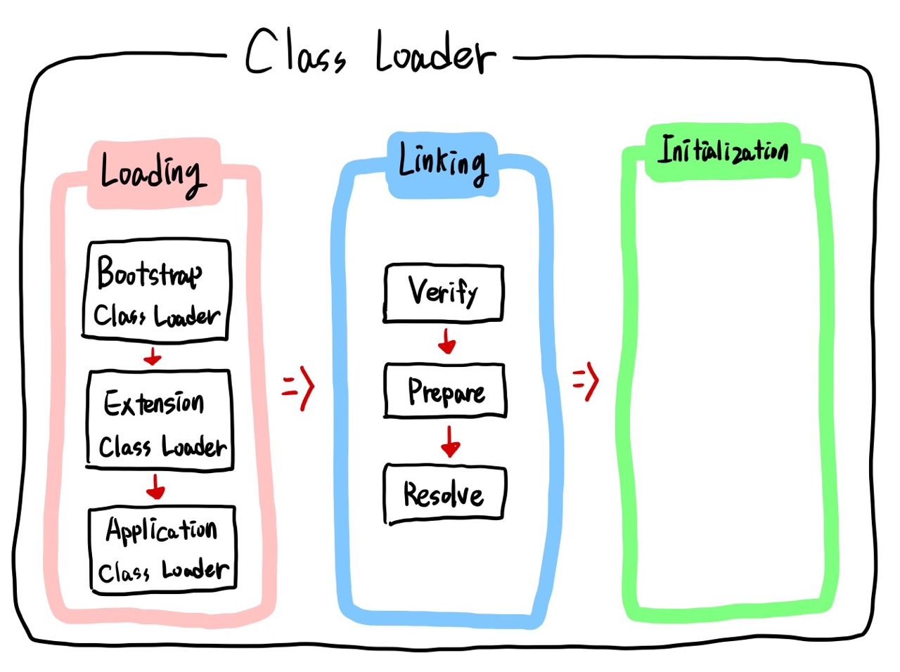 - 클래스 파일을 사용하기 위해 필요한 메모리 할당 및 연결하고, 검증하고, 기본값으로 초기화하는 과정
