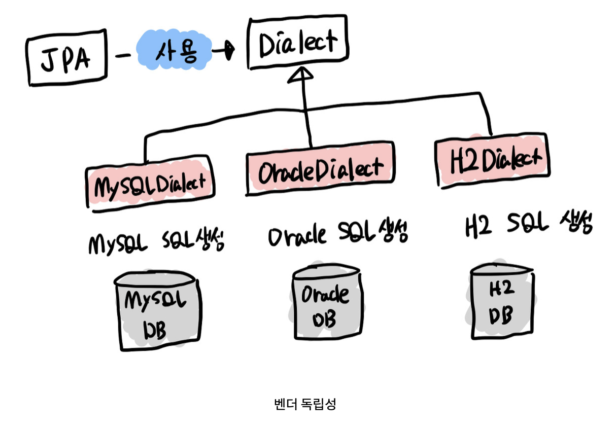 개발자는 JPA가 제공하는 표준 문법에 맞춰 사용하면 되므로, 특정 DB에 의존적인 SQL은 Dialect가 처리해준다.