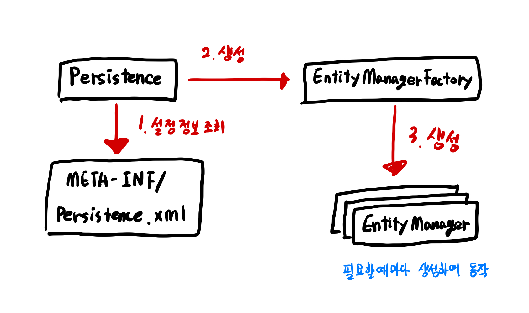 1. Persistence 클래스에서 META-INF/persistence.xml에서 설정 정보를 읽는다.
