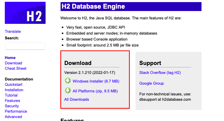 H2 Database Engine Welcome to H2, the Java SQL database. The main features of H2 are: Very fast, open source, JDBC API Embedded and server modes; in-memory databases Browser based Console application Small footprint: around 2.5 MB jar file size Supp
