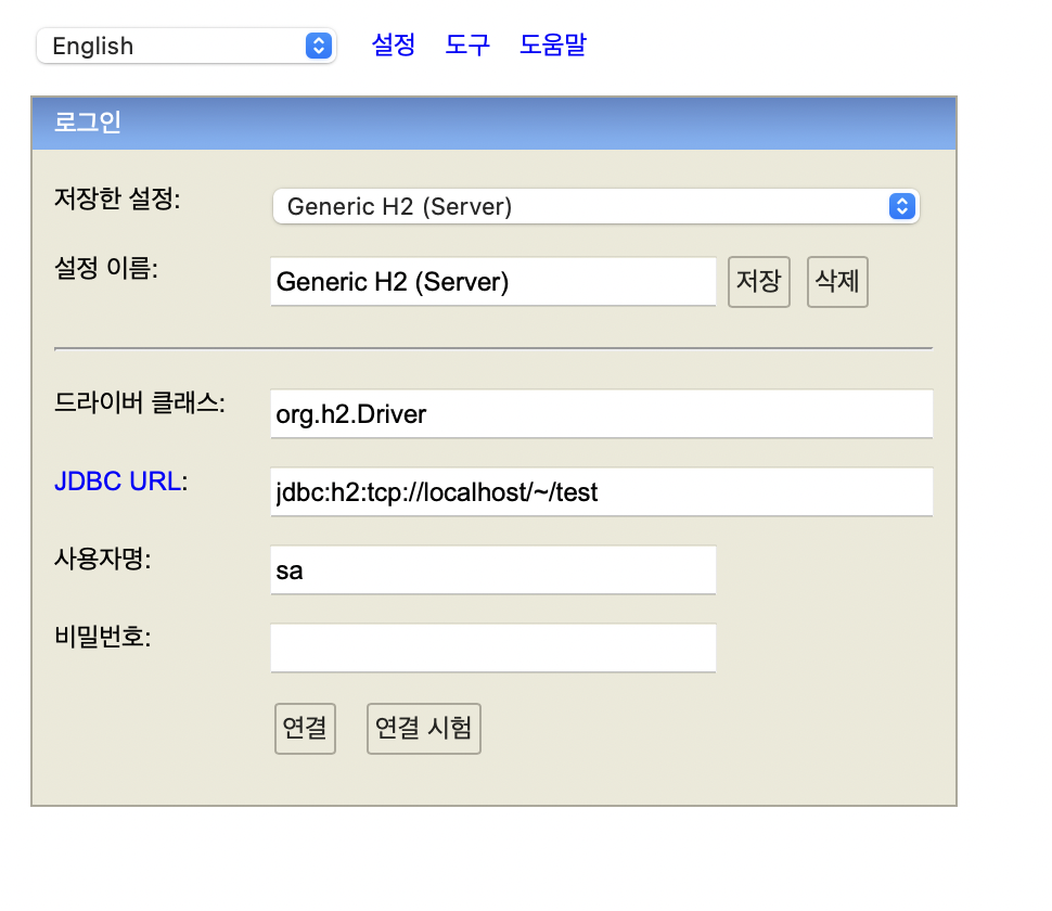 실행하면 이렇게 H2 데이터베이스에 접속할 수 있는 사이트가 나오는데 처음에는 그대로 연결하면 된다.
