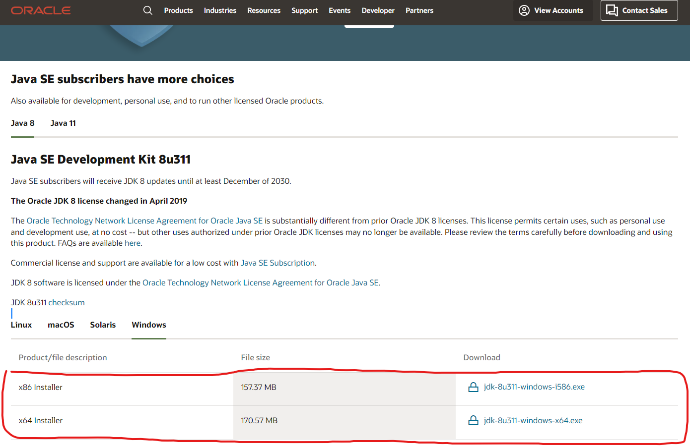 만약 Java SE 8u311 을 눌렸다면 다음과 같은 화면이 보이는데 자신의 컴퓨터 운영체제 비트로 다운로드하면 된다.