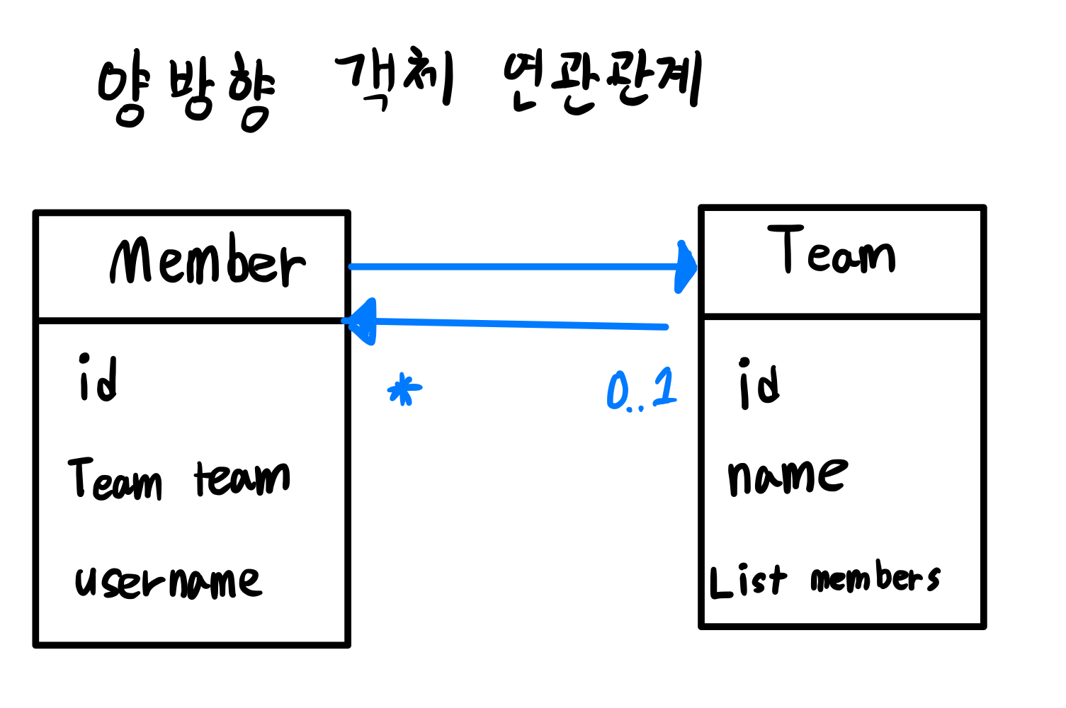 객체간에 연관관계를 양방향으로 하려면 반대쪽에도 필드를 추가해서 참조를 보관해야 한다.