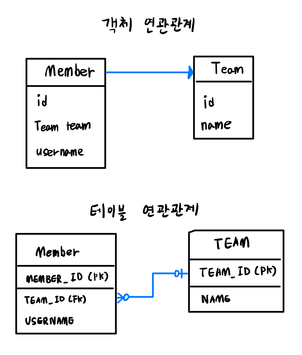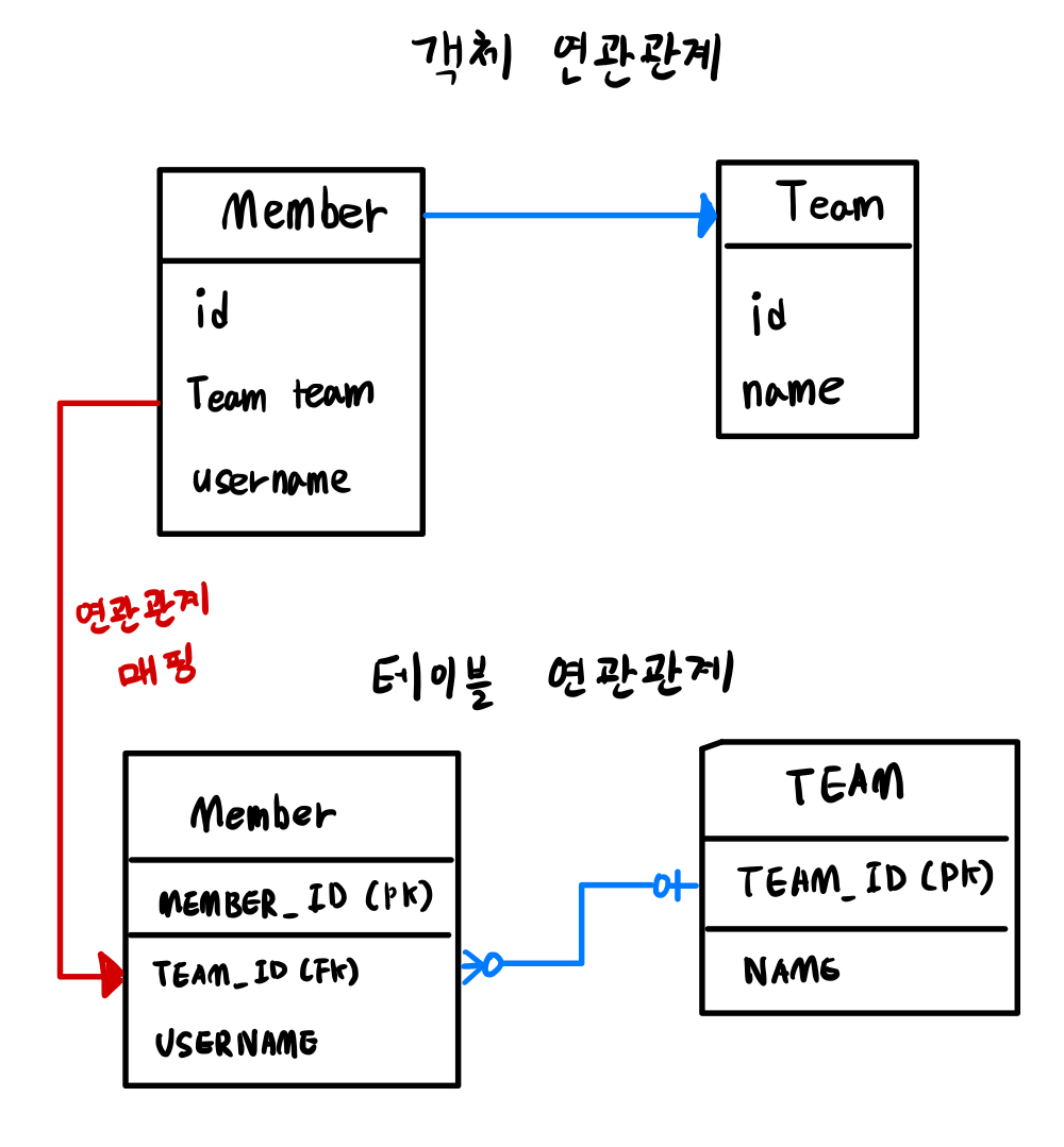 JPA를 사용해서 객체 연관관계와 테이블 연관관계를 매핑하면 위 그림처럼 된다.