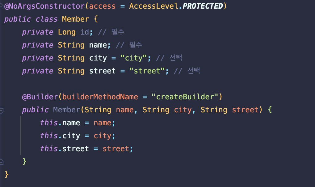 최종적으로 위와같이 기본 생성자를 제한해주고, Class위가 아닌 생성자에 @Builder를 붙여주는것이 좋다.