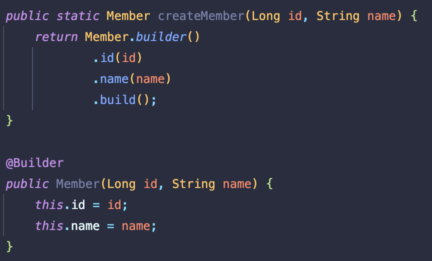 이렇게 Member 클래스 안에 정적 멤버 클래스로 Builder 클래스가 있는 구조이다.
