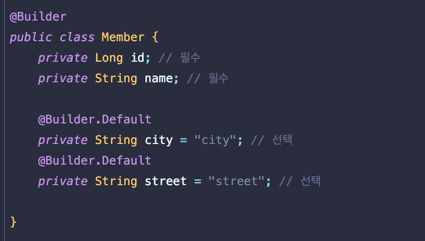 이러한 빌더 패턴을 Lombok(롬복)에서 @Builder 어노테이션으로 지원한다.