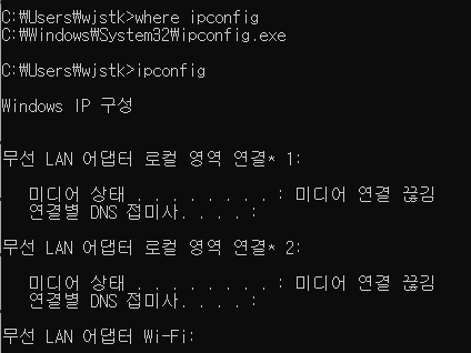 where ipconfig를 치면 ipconfig의 경로가 나온다.