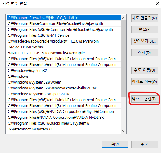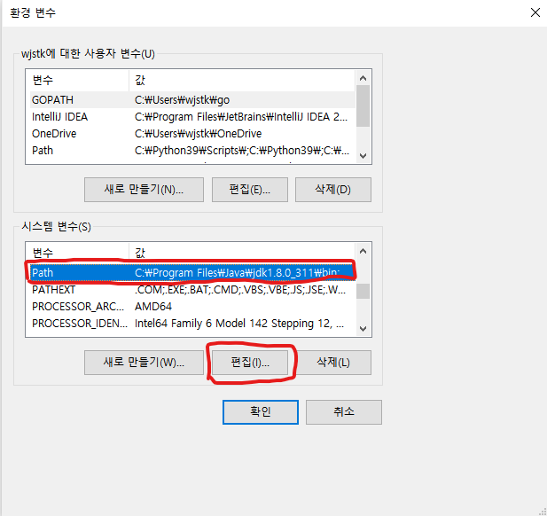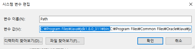 5. 변수 값 맨 앞에 C:\Program Files\Java\jdk1.8.0_311\bin; 을 추가하고 확인을 누른다.
