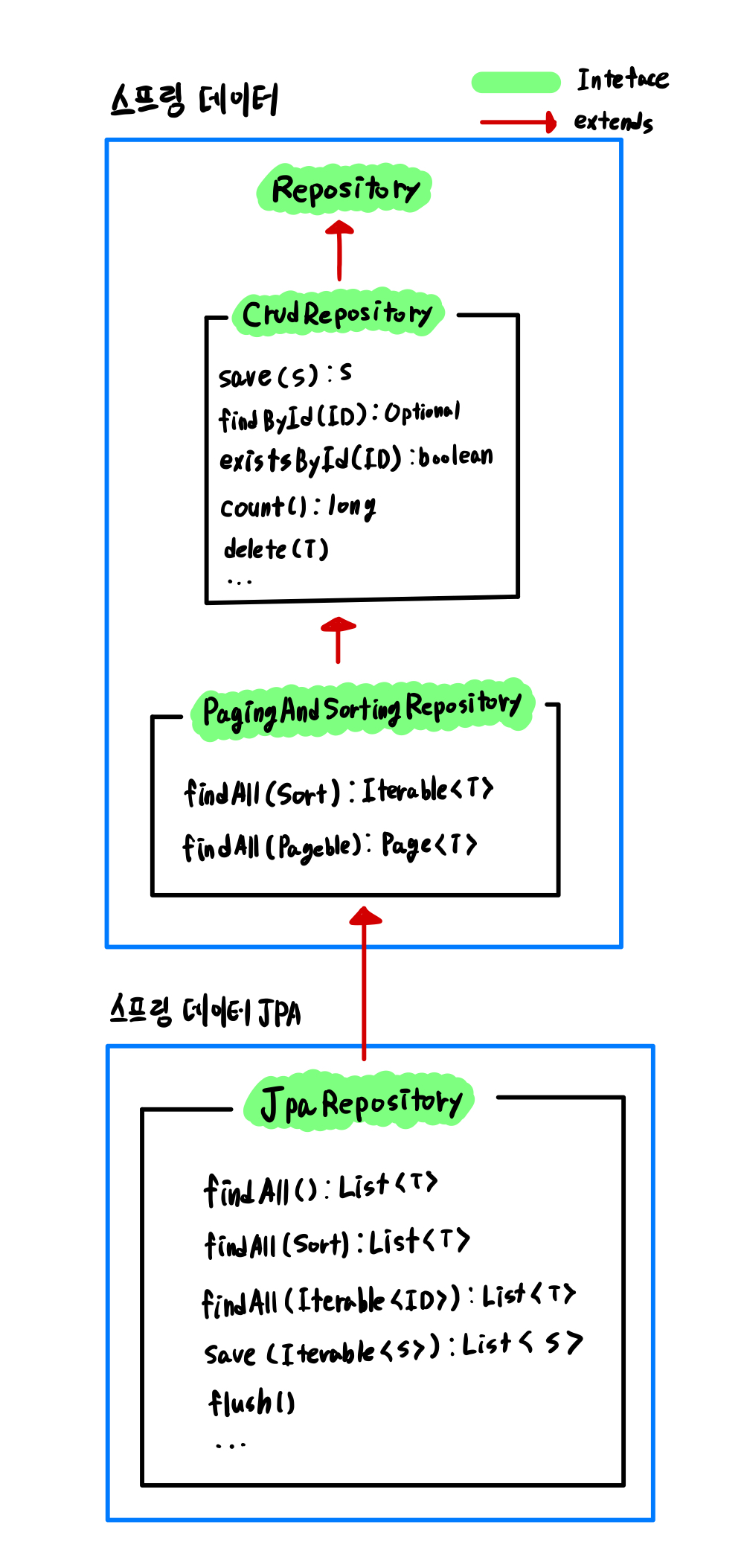 이 공통으로 사용하는 인터페이스는 Repository, CrudRepository, PagingAndSortingRepository가 있다.