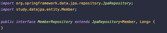 그래서 위와같이 Interface로 상속받아 사용하는데 이 때 JpaRepository<엔티티클래스, 엔티티클래스의 PK 타입>을 지정한다.